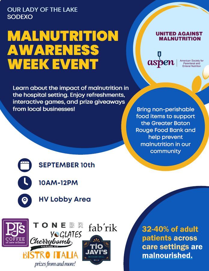 September 8-12 is Malnutrition Awareness Week, a national campaign organized by the American Society for Parenteral and Enteral Nutrition. All are invited to join the clinical nutrition team at Our Lady of the Lake and the MSNS students at FranU to bring awareness to protein calorie malnutrition, a crippling disease that affects up to 40% of adults across care settings, during this year's Malnutrition Awareness Event. There will be lots of games, prizes, and snacks from local vendors.