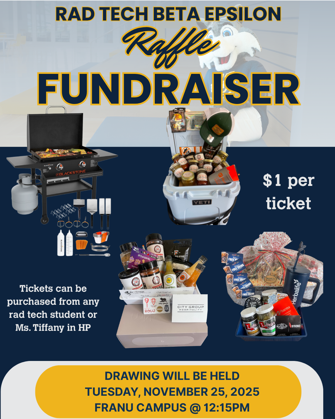 Rad Tech Beta Epsilon is hosting a raffle fundraiser. Tickets can be purchased for $1 from any rad tech student or Ms. Tiffany in the Health Professions Building. The drawing will be held Tuesday, November 25, 2025 at 12:15 p.m..