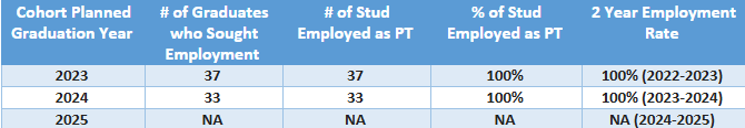 Program graduates will have a two-year average employment rate of greater than 95% among graduates who are actively seeking employment in the field of physical therapy within one year of graduation.