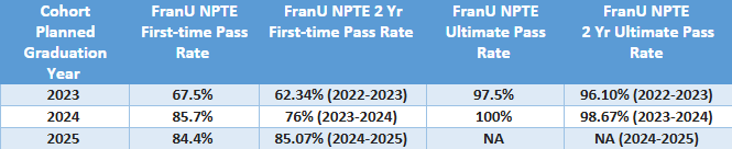 Excellent preparation for NPTE - FranU DPT graduates are well prepared for the National Physical Therapy Examination. Our program goal is that graduates have an ultimate pass rate of greater than 90%, and the two-year average ultimate pass rate for the past year was 99%.